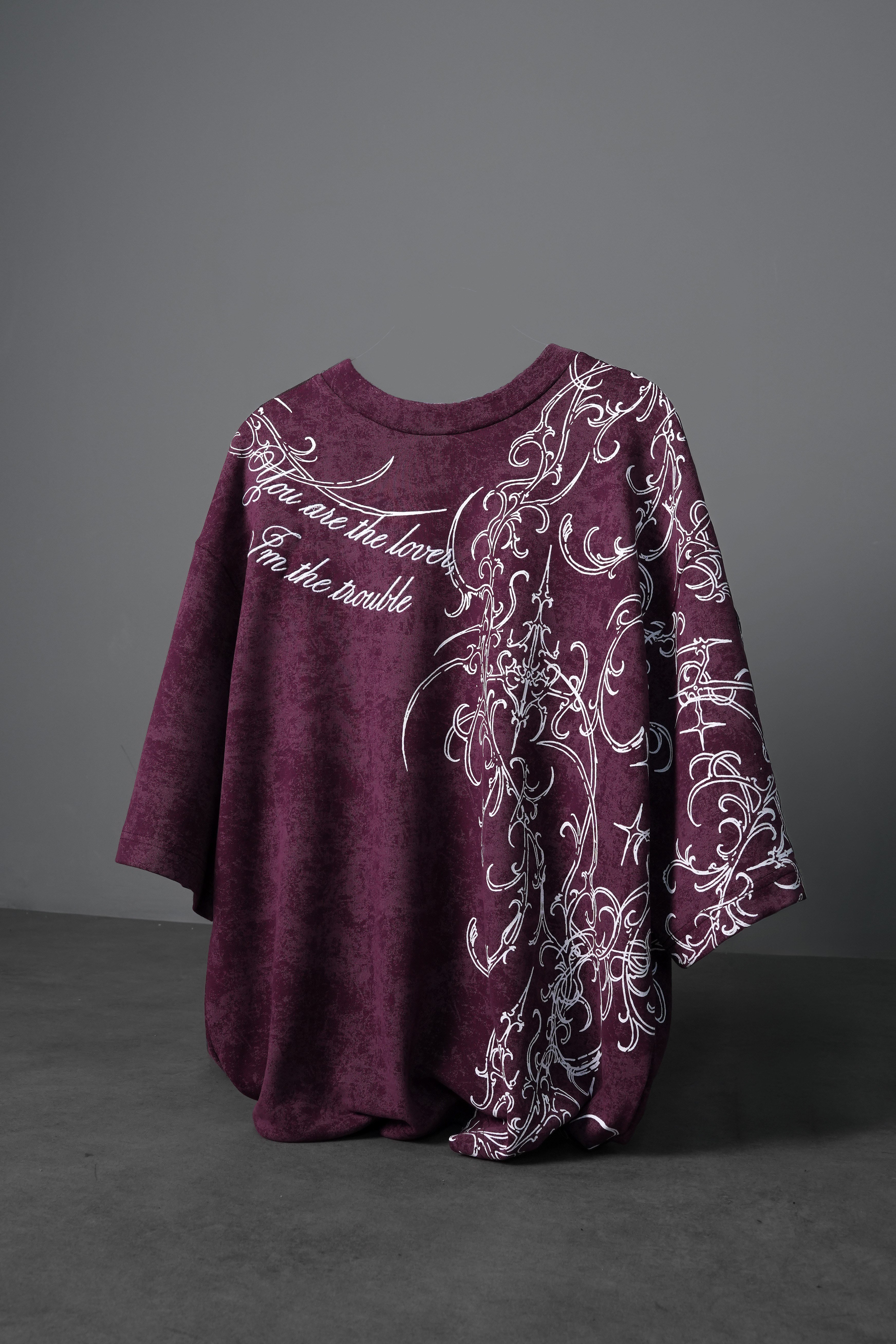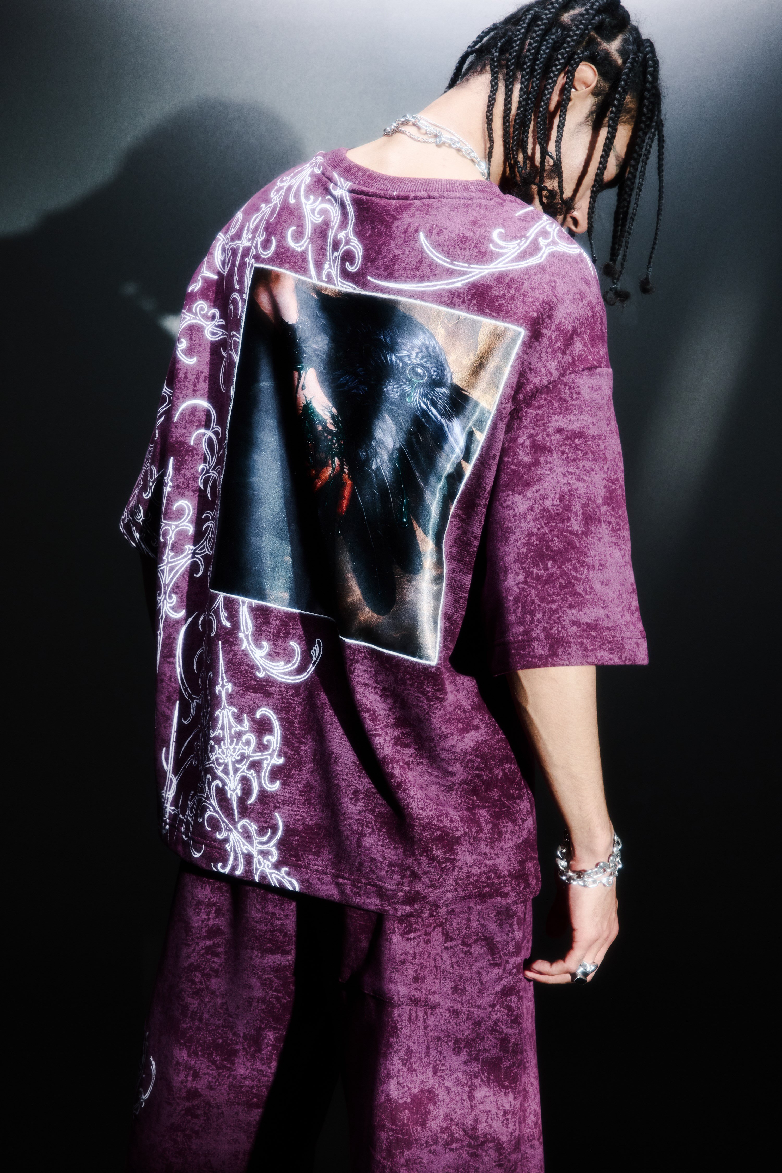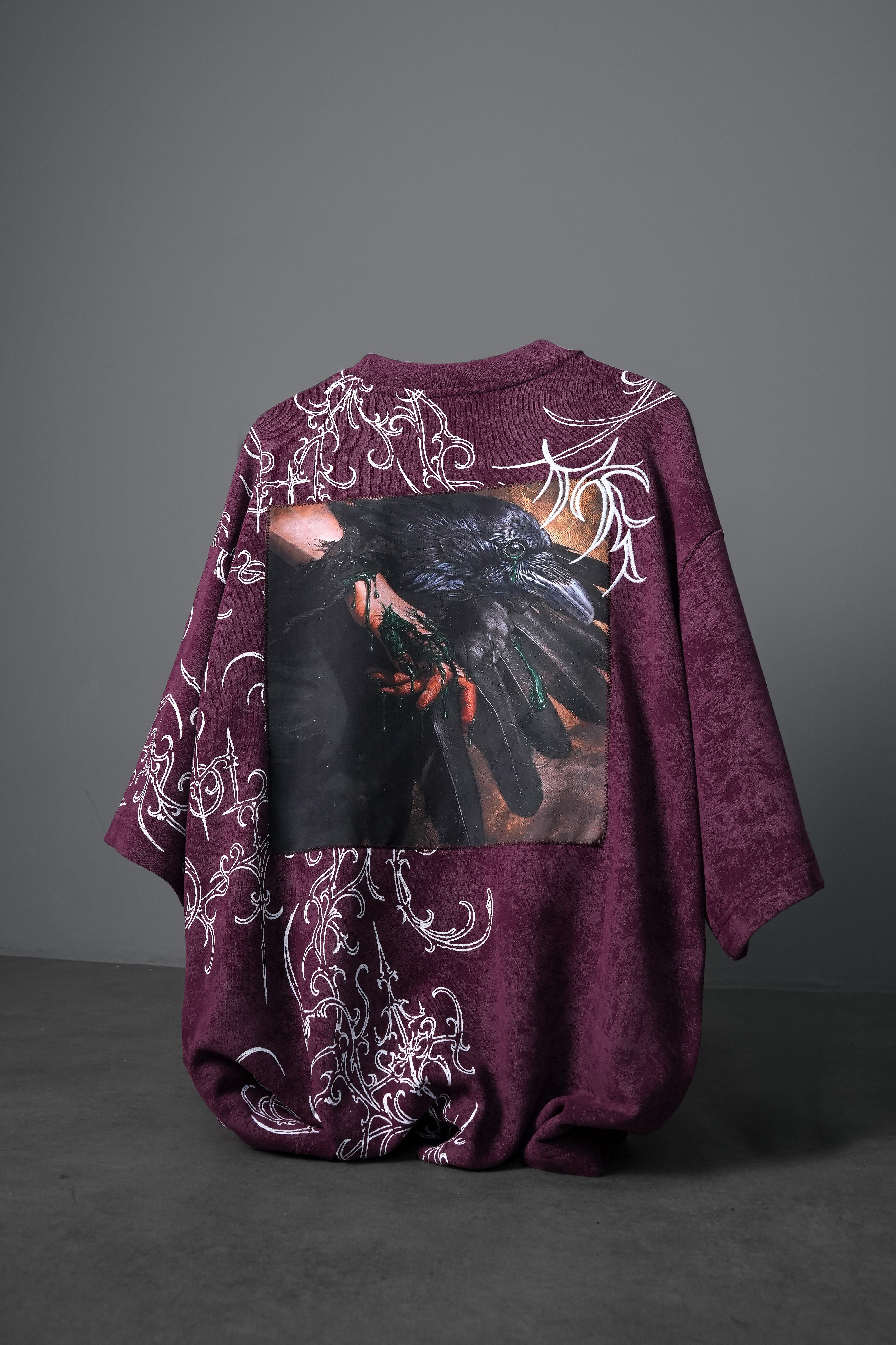 Erkek Mürdüm Crow Patch Oversize Yıkama Efektli Tshirt (S10035)