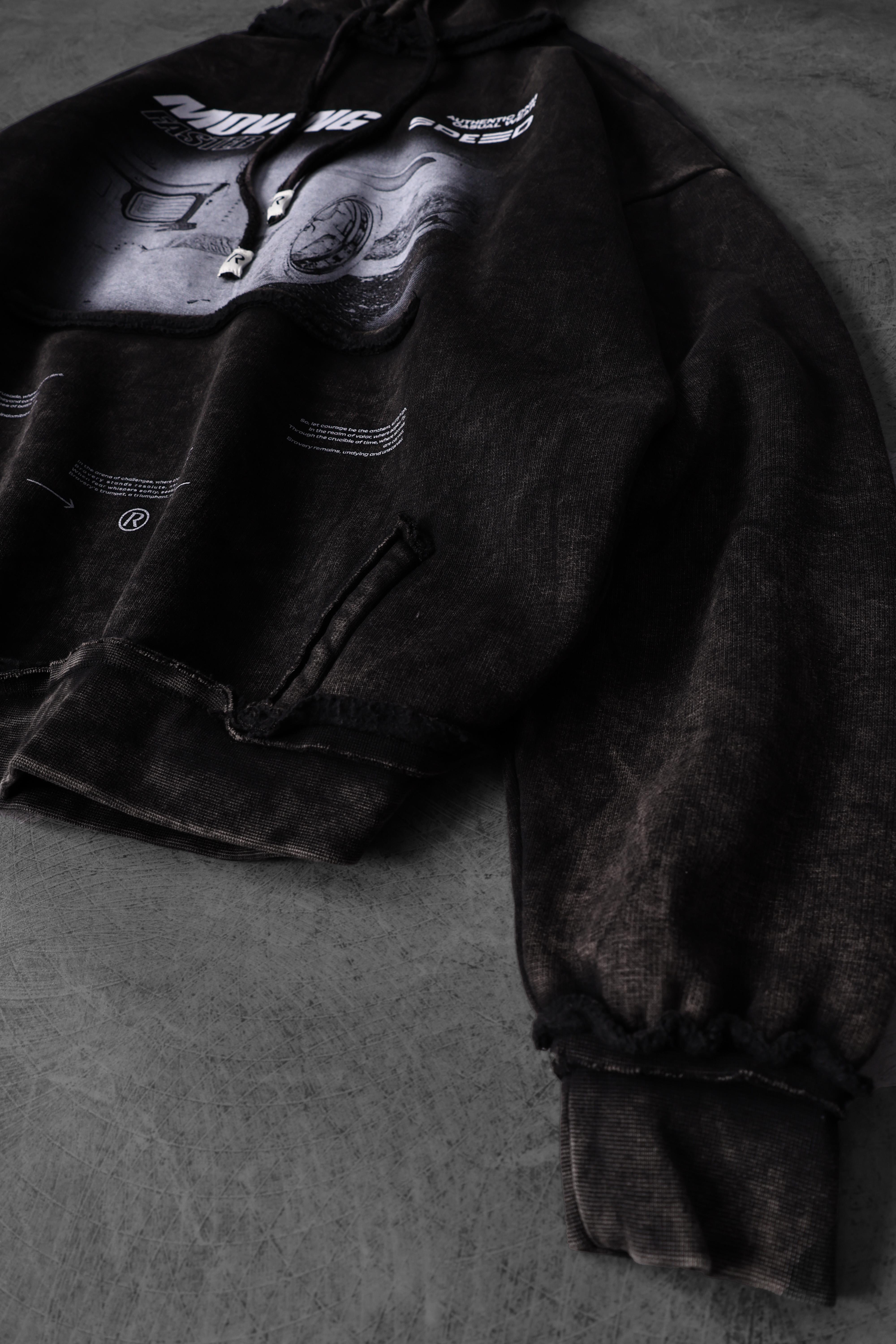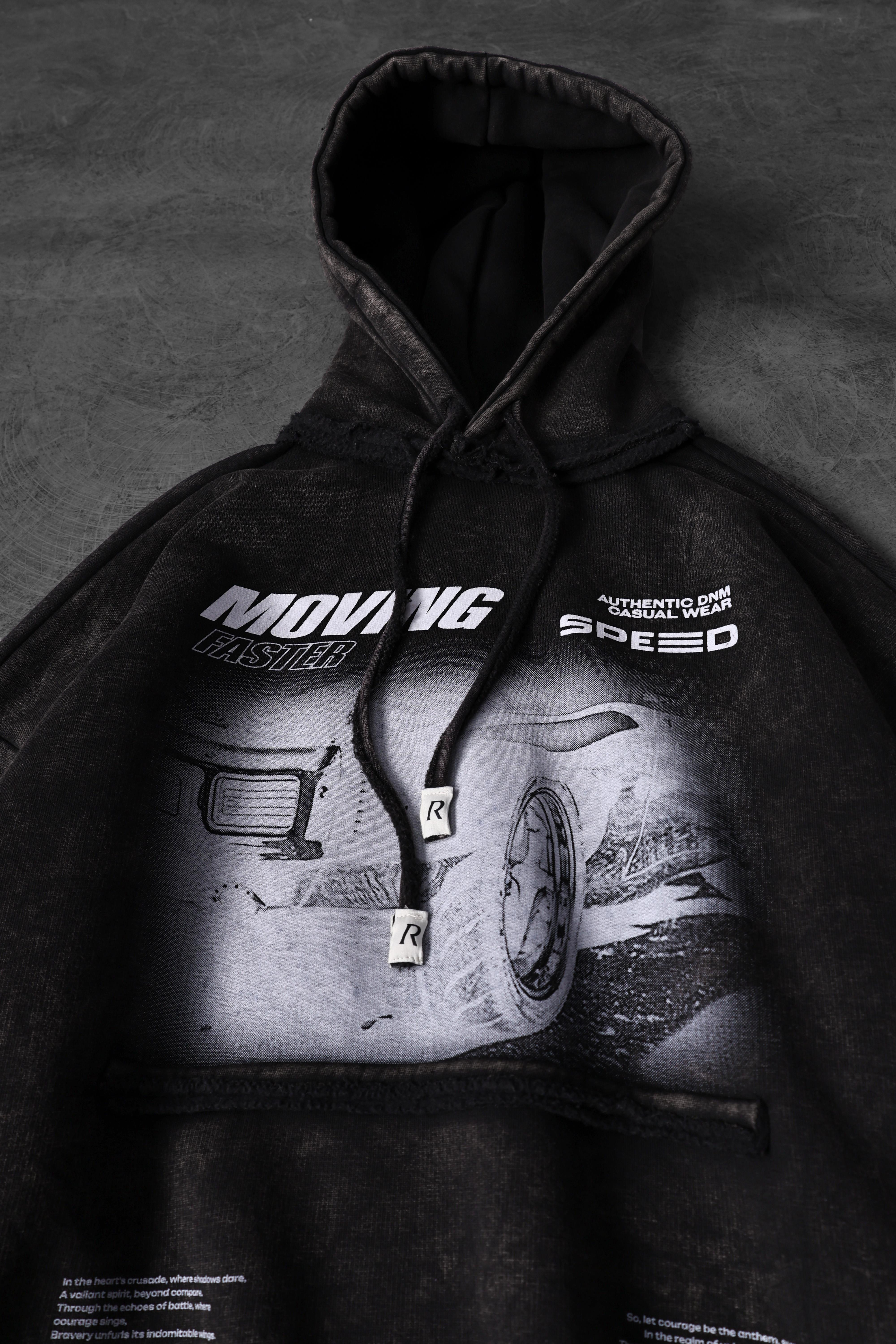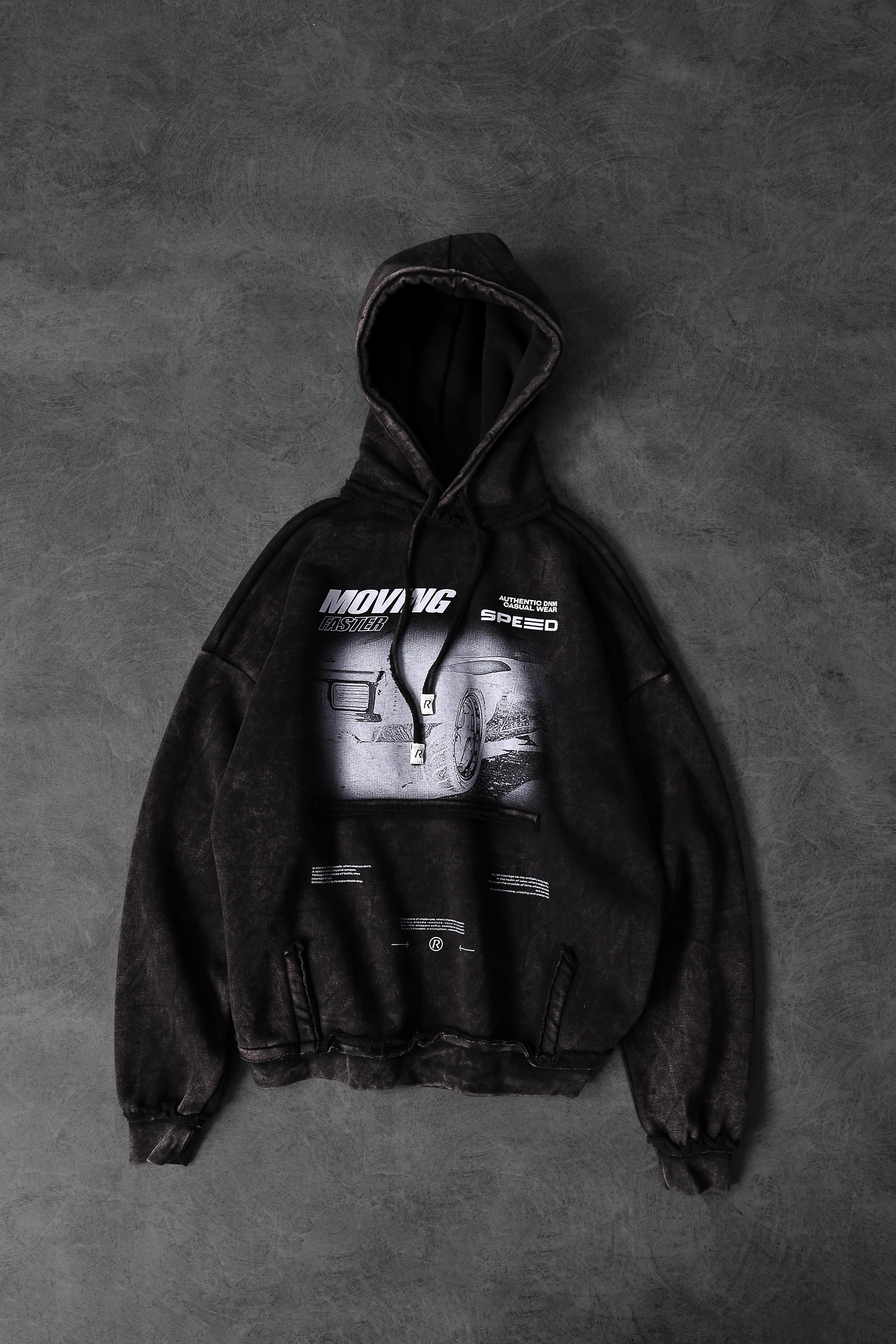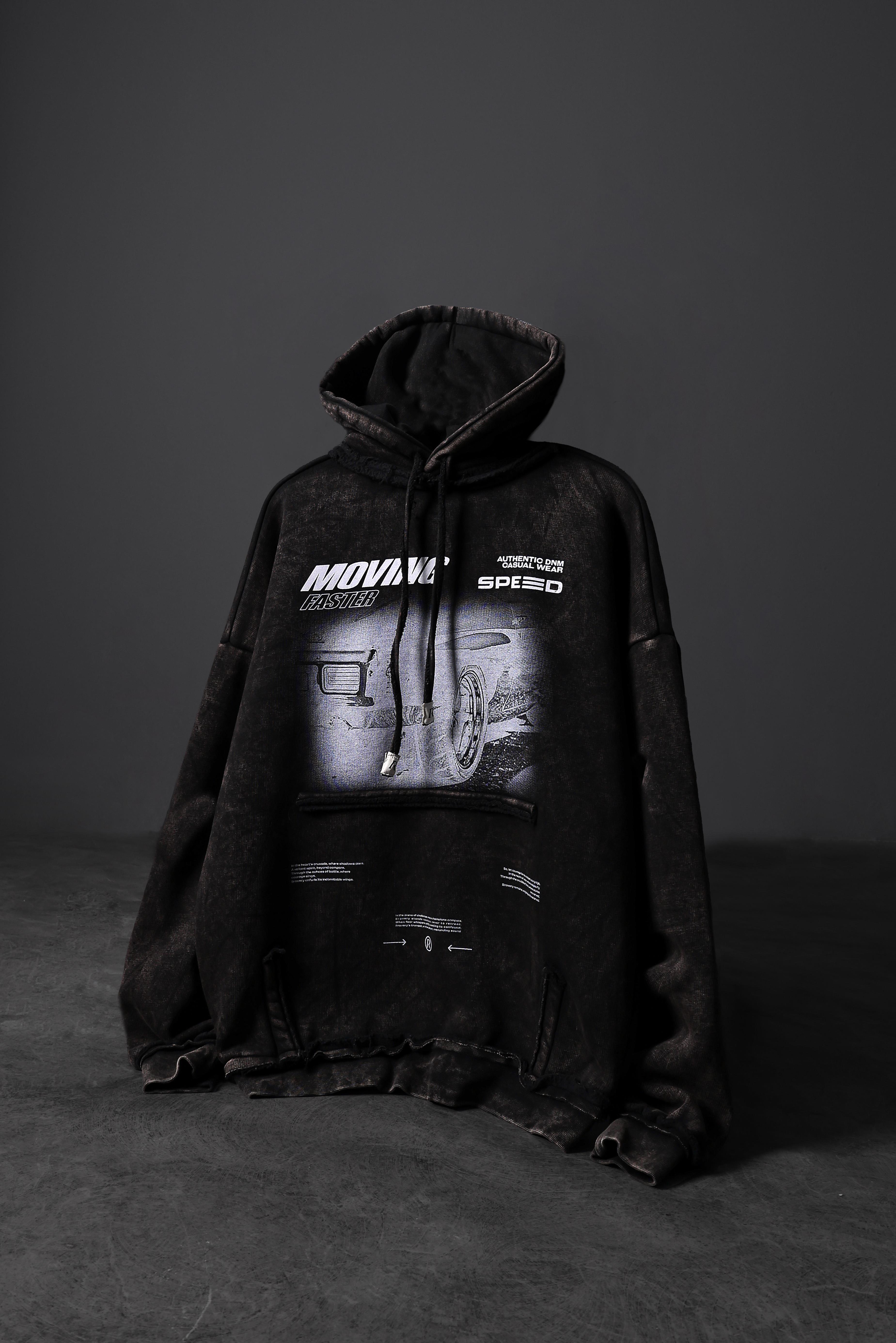 Erkek Siyah Moving Faster Özel Yıkamalı Oversize Kapüşonlu Sweatshirt (S5617)