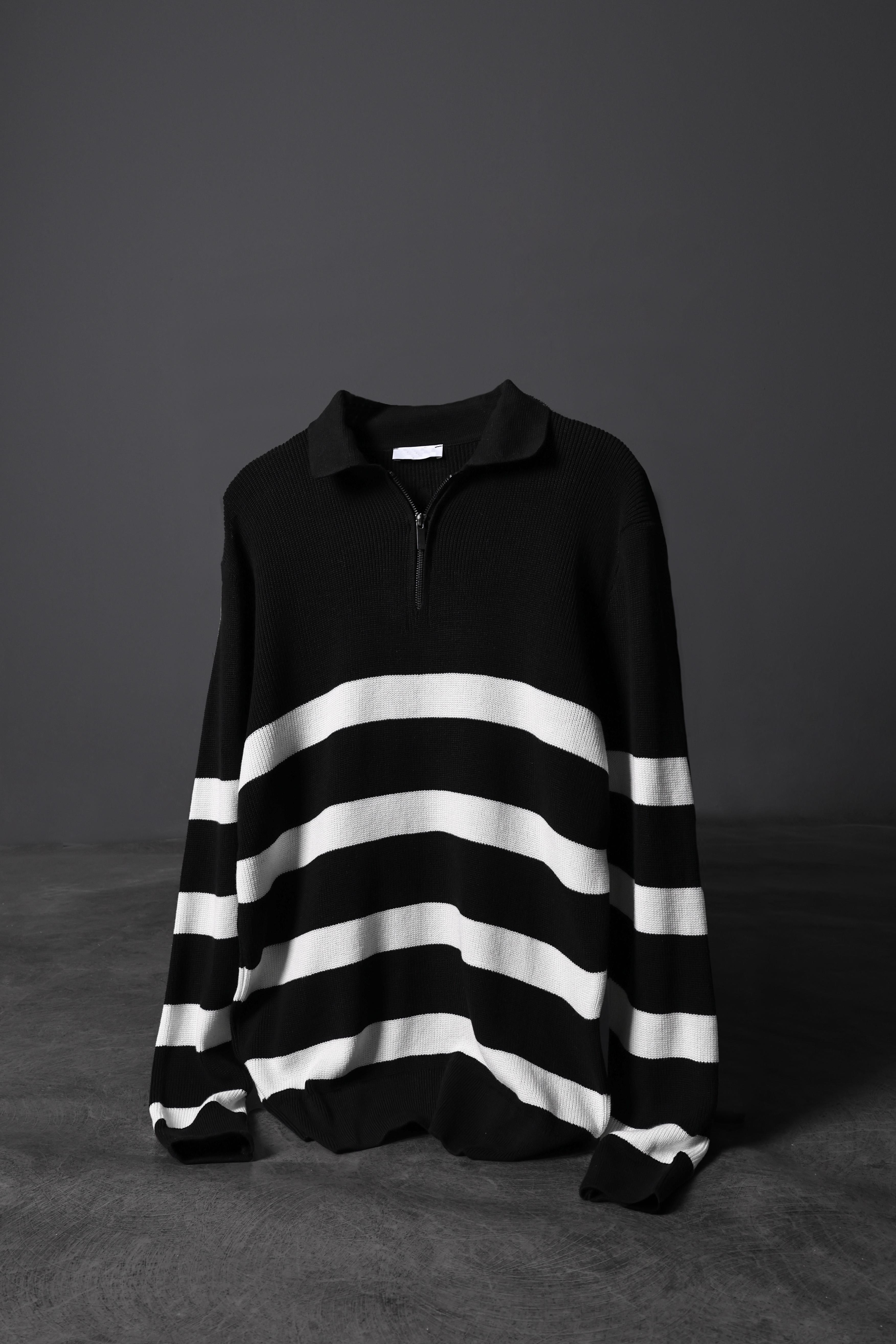 Erkek Siyah Şeritli Yarım Fermuar Oversize Triko Kazak (S5634)