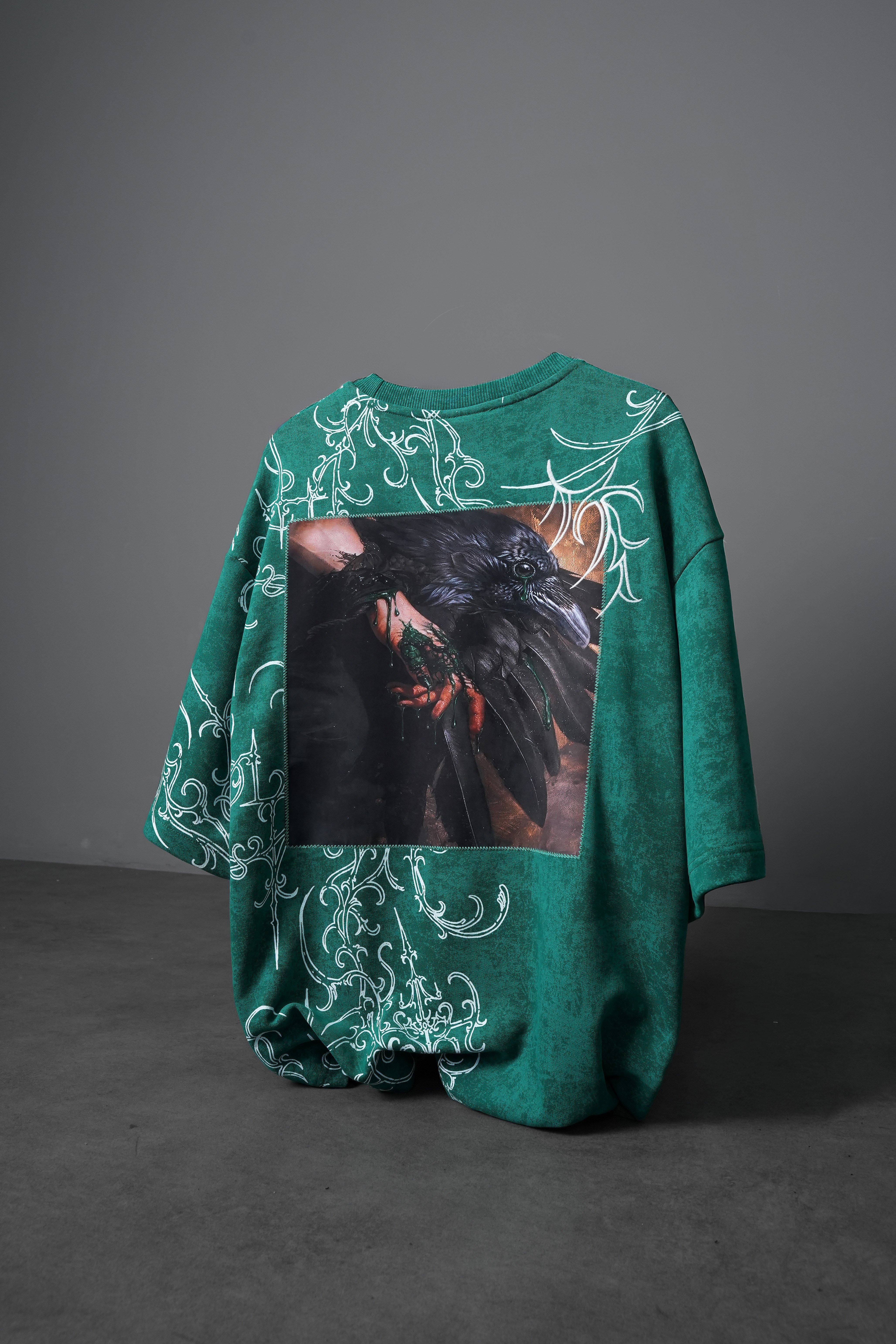 Erkek Yeşil Crow Patch Oversize Yıkama Efektli Tshirt (S10035)